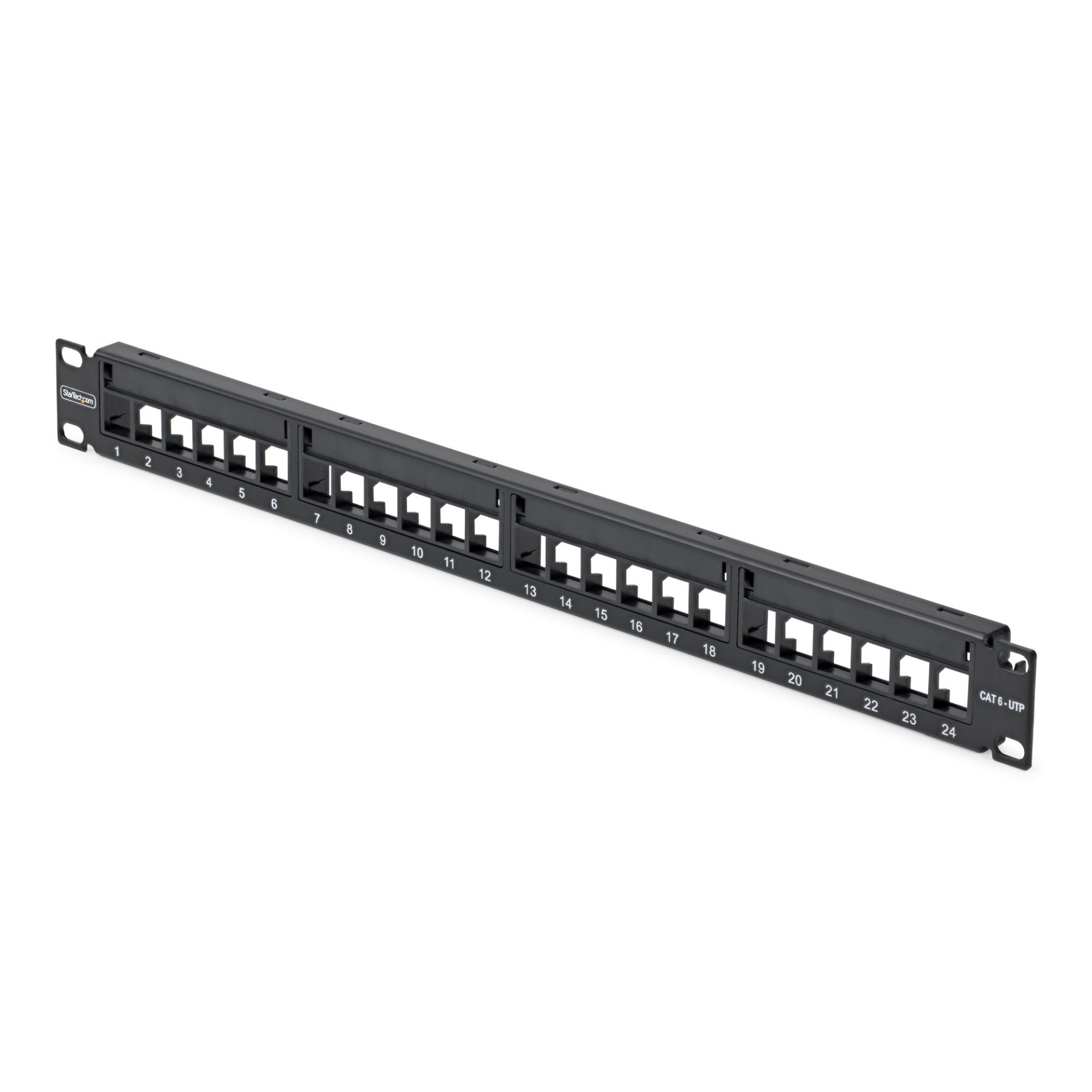Organize up to 24 Cat6 cables using this blank UTP keystone patch panel and cable management bar
